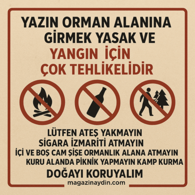 MagazinAydın.com olarak yaz mevsiminin kavurucu sıcaklarında bir kez daha doğamıza sahip çıkmaya çağırıyoruz. Orman yangınları her yıl binlerce hektarlık yeşil alanı yok ediyor, hayvanların yuvaları kül oluyor, ciğerlerimiz yanıyor. Bu felaketin en büyük sebebi ise ne yazık ki insan ihmali!